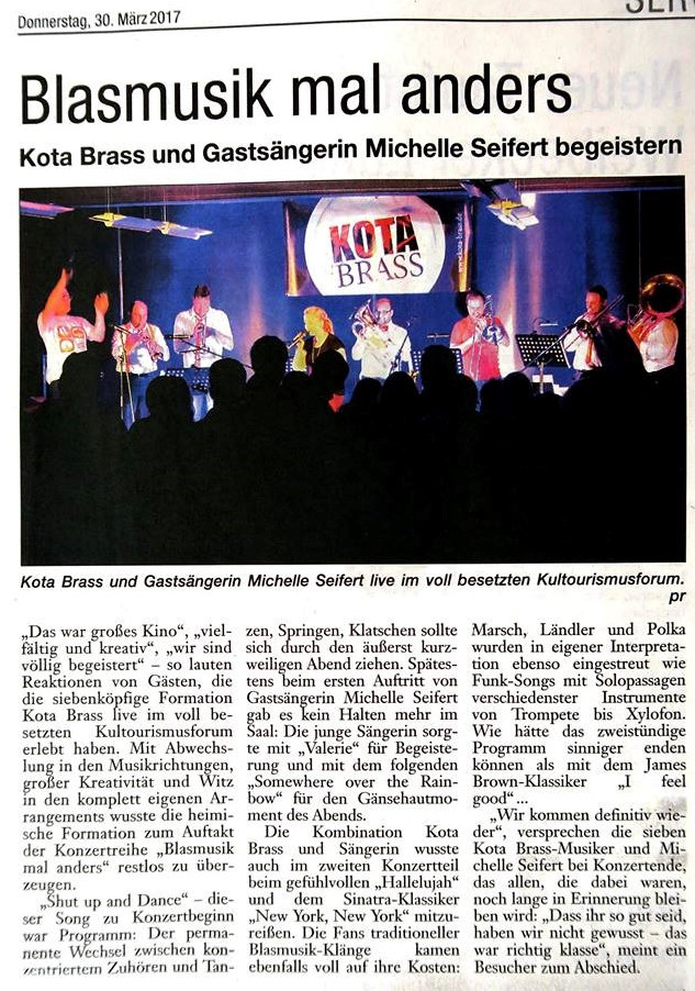 Gesanglich unterstützt wird KOTA BRASS von der jungen, charmanten Ausnahmesängerin Michelle Seifert, die sich bereits in den letzten Bühnenprogrammen direkt in die Herzen des Publikums gesungen hat.